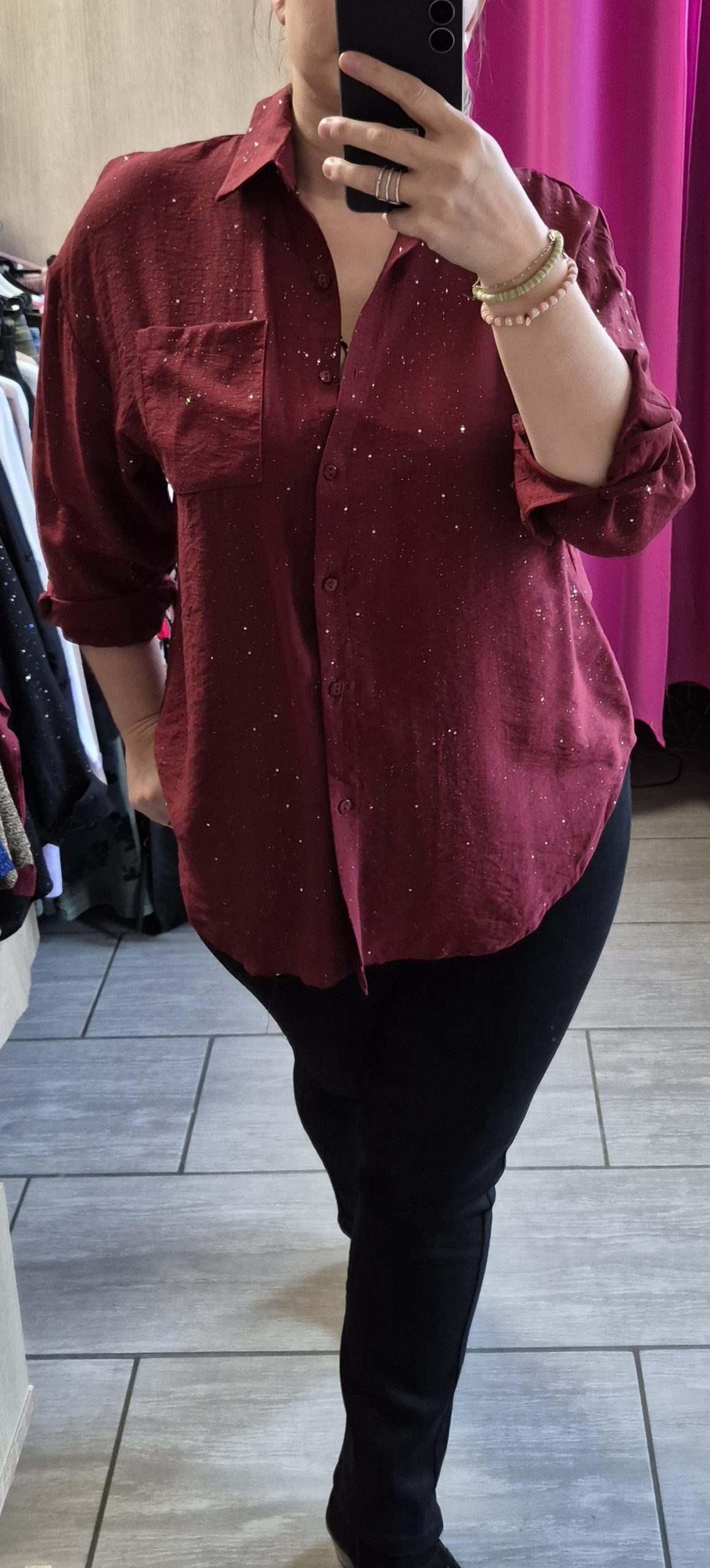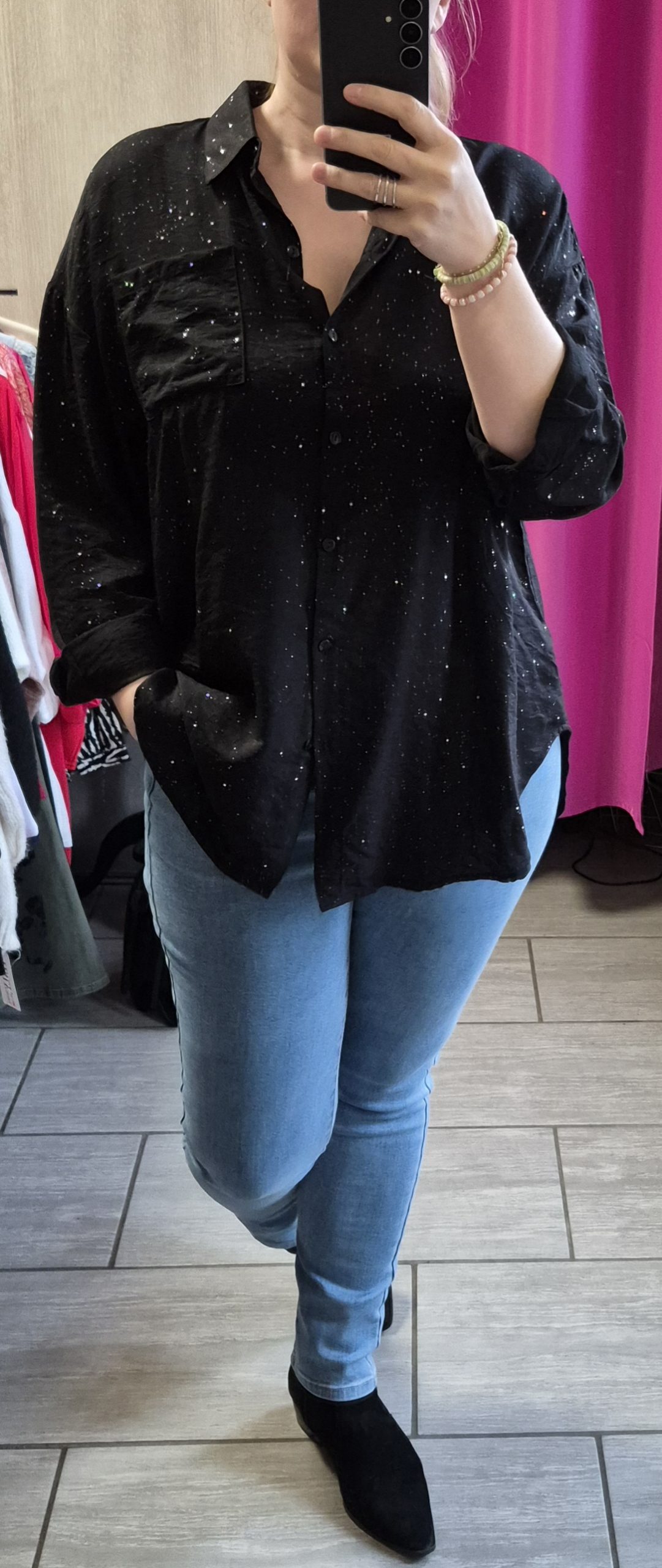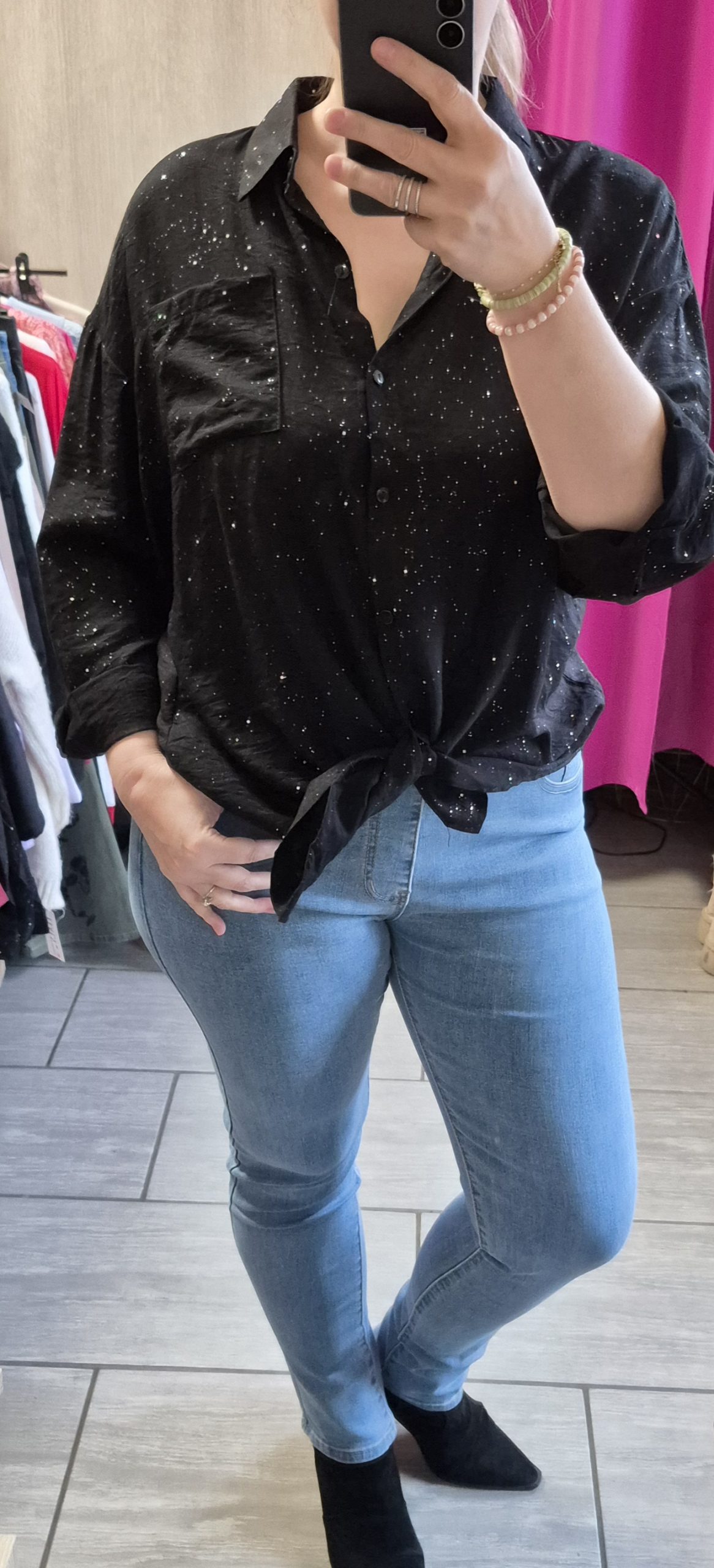 Chemisier coupe loose, avec paillettes incrustées dans le tissus.