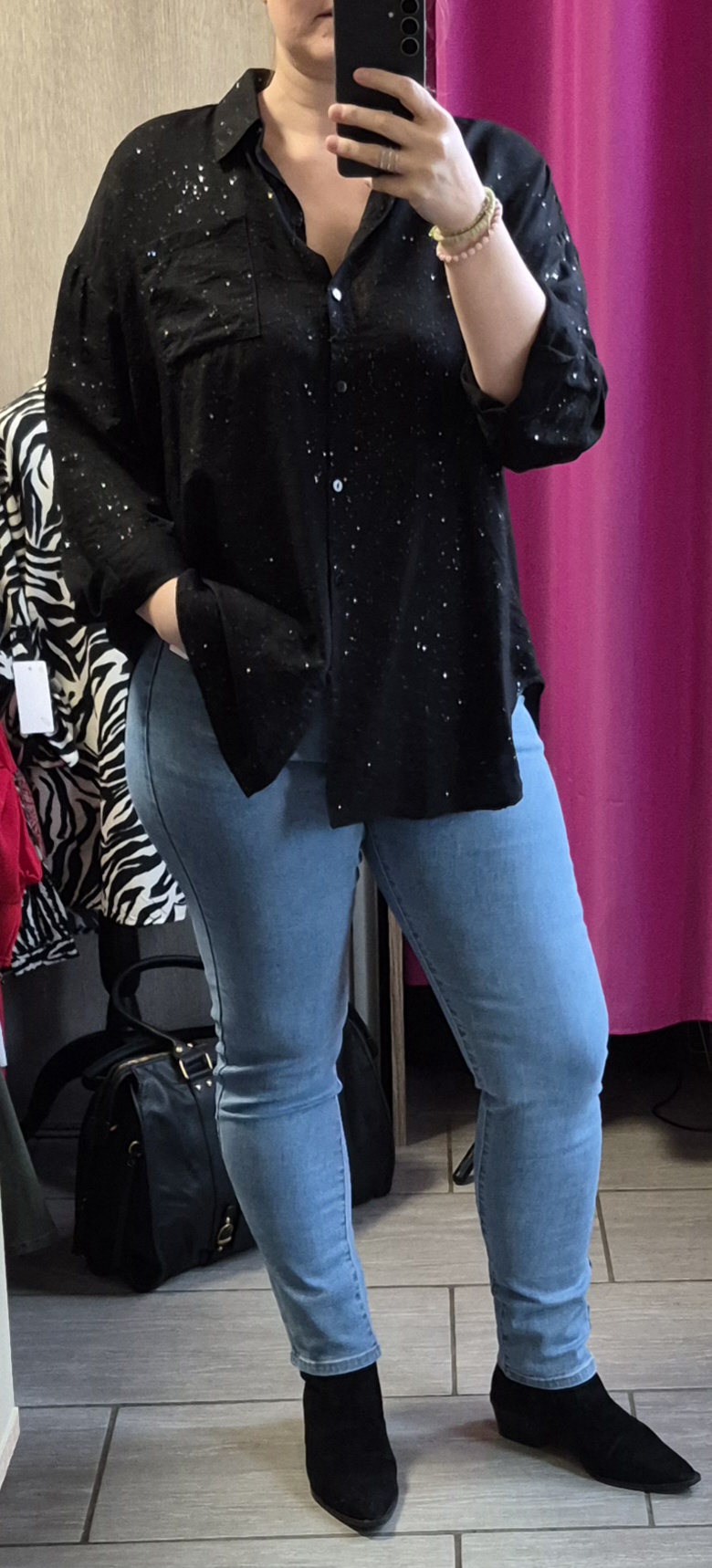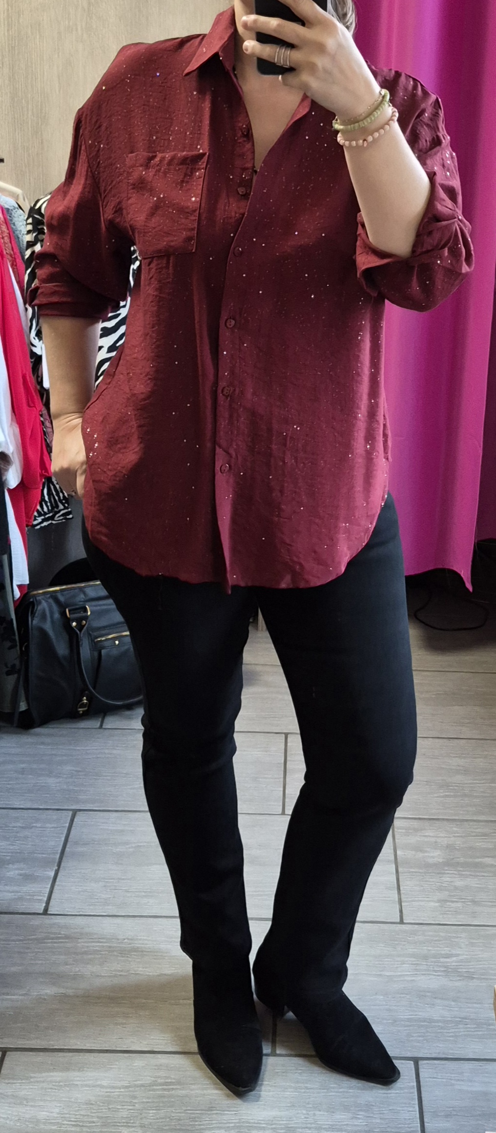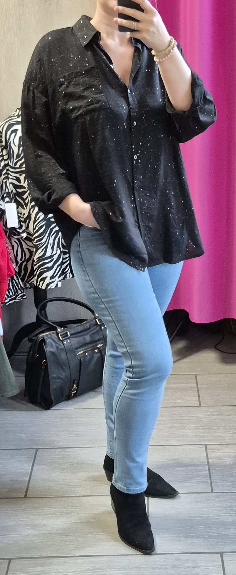 Chemisier coupe loose, avec paillettes incrustées dans le tissus.