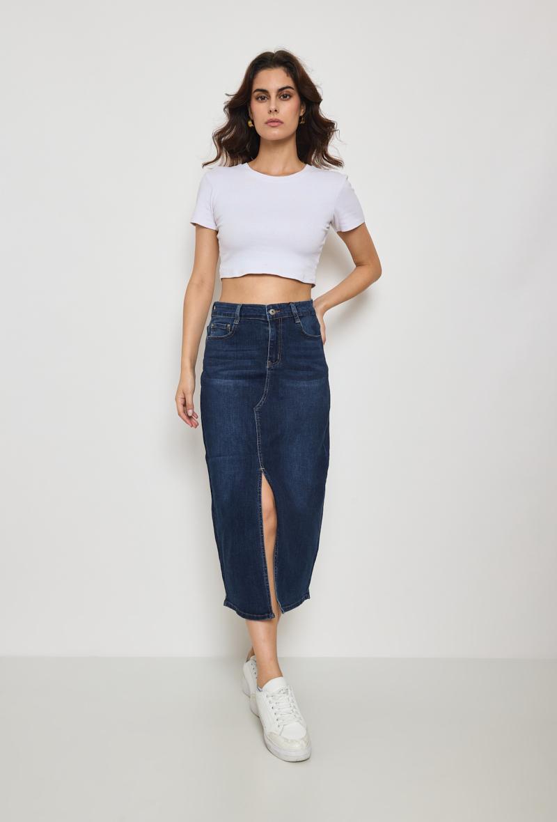 Jupe en jean longue, fendu sur le devant, avec couture zkg zag.