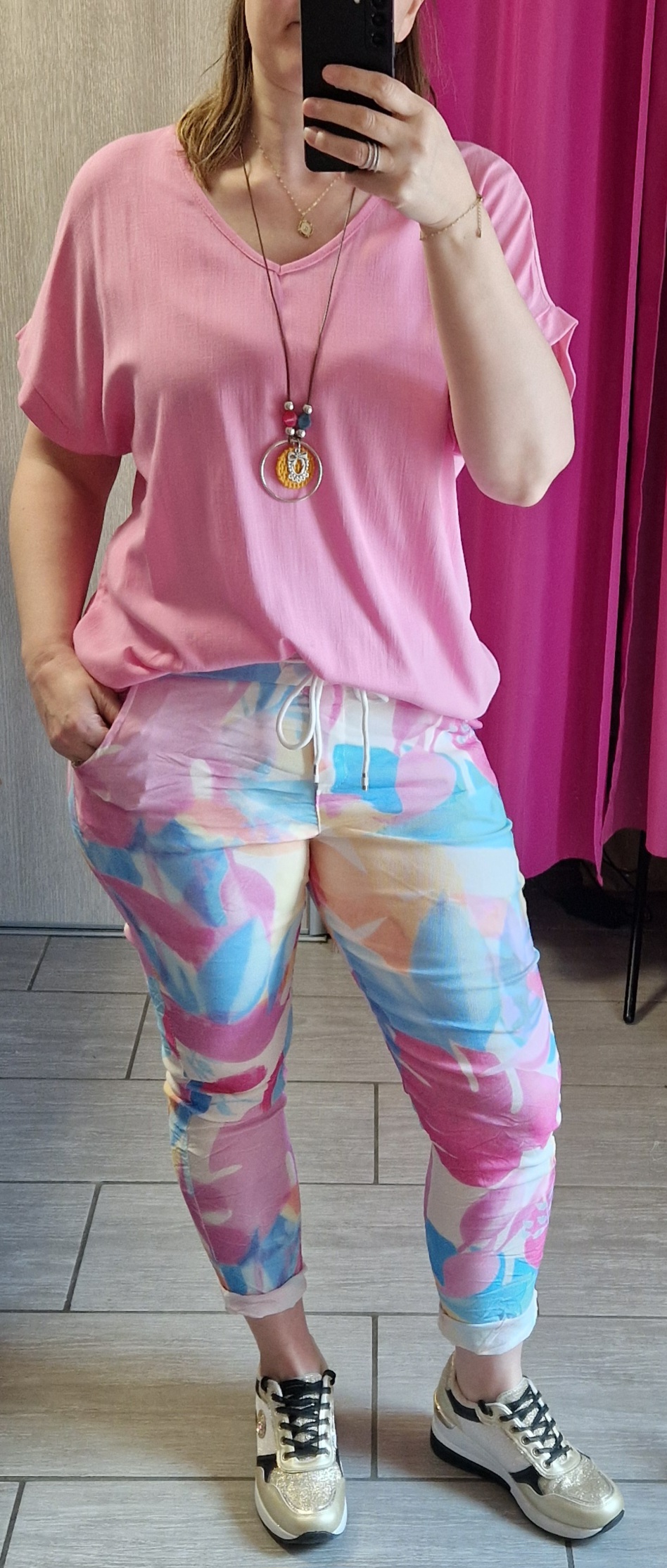 Pantalon stretch, taille élastique avec cordon.